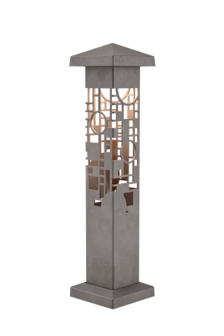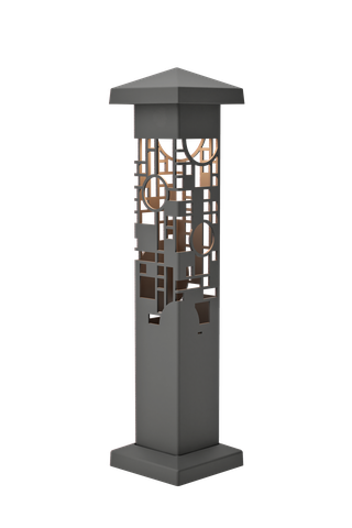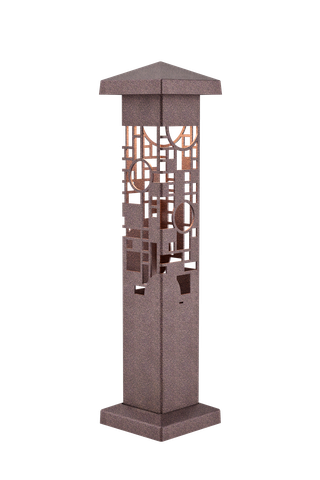 The Nightscaping®Garden Series Wright GEO 4×4 design, is based on a Frank Lloyd Wright, stained glass design of three panels in the Avery Coonley Playhouse in Riverside, IL. Wright referred to this triptych as a “kinder symphony”. Unlike Wright’s early designs with their nature derivations, the Playhouse windows are purely geometric in composition and feature bright, mostly primary colors. This design may have been inspired by a parade. The geometric shapes simulate a haphazard, yet controlled, arrangement of balloons, confetti and flags. The windows were the focal point of the playhouse, which was actually a kindergarten operated by Mrs. Coonley.