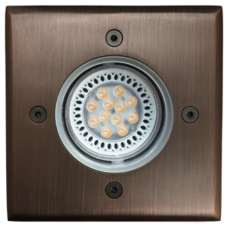 The Contemporary well light with square faceplate features an adjustable gimbal for precise lamp direction. Faceplate is weathered brass, lens is tempered glass, and body is durable composite. Uses MR16 lamp. 5-foot 18/2 pigtail. M5 Hex, Need 3mm Hex Tool for Installation.