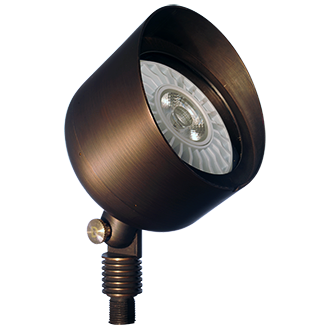 The Epic cast brass 12-volt PAR36 uplight is enclosed with a clear tempered lens. The shroud is a “lock-and-load” configuration with an O-ring. Heavy-duty composite stake included, and other mounting options are available. 5-foot 18/2 wire lead is factory installed. 3.4 lbs.