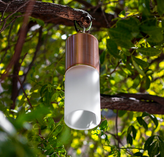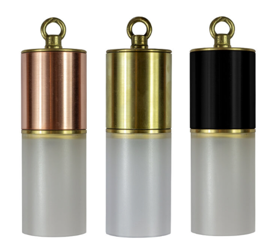 The Glacier fixture is available in the following finishes with a frosted acrylic shade: machined copper, brass, or brass with black Cerakote®.
