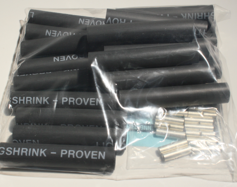 (20) Gasket lined UL® approved protective sheaths and (20) UL®, CSA® certified, crimp/barrel connectors. When using our ratcheting crimping tool, this size typically connects (2) 12 gauge stranded feed/main wires to (2) 16-18 gauge stranded lighting wires. Gasket lined protective sheaths are 1/2" across and the length is approximately 4". This extra length ensures enough inner gasket material is delivered to any exposed strands and down the wire jacket.