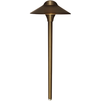 The Newport path light features a 6.26” diameter cast brass hat. Its underside is a powder-coated reflective white surface. 3W integrated LED with a 2700K or 3000K color temperature. Factory-installed 5’ wire lead. Polycarbonate clear lens. 10-year warranty.