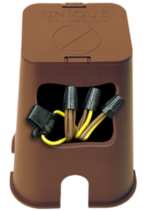 The Satellite™ HUB is the ultimate In-Line fuse protected wiring system and the future of Landscape Lighting Wiring. Unique includes a replaceable 20 and 10 amp fuse at the point of connection allowing you to size the fuse according to load or wire size, thus making troubleshooting accessible, convenient and fast. The Satellite HUB includes three barrel lugs with lithium greased caps and an In-Line 20 amp fuse. The dark brown housing blends discreetly for above or below ground installation.