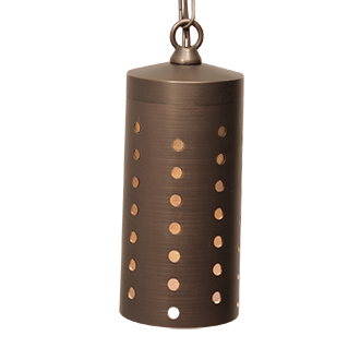 The Sky suspended path light with brass chain is crafted from solid brass. Features a decoratively patterned shroud. Uses one bi-pin or MR16 LED lamp. Heavy-duty composite stake included. Other mounting options are available. 5-foot, 18/2 wire lead.