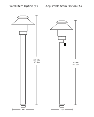 The Zion 4” Path Light comes complete with a fully adjustable reflector top. It is available in a standard 18” fixed stem or a 17” to 28” adjustable stem. ETL listed.